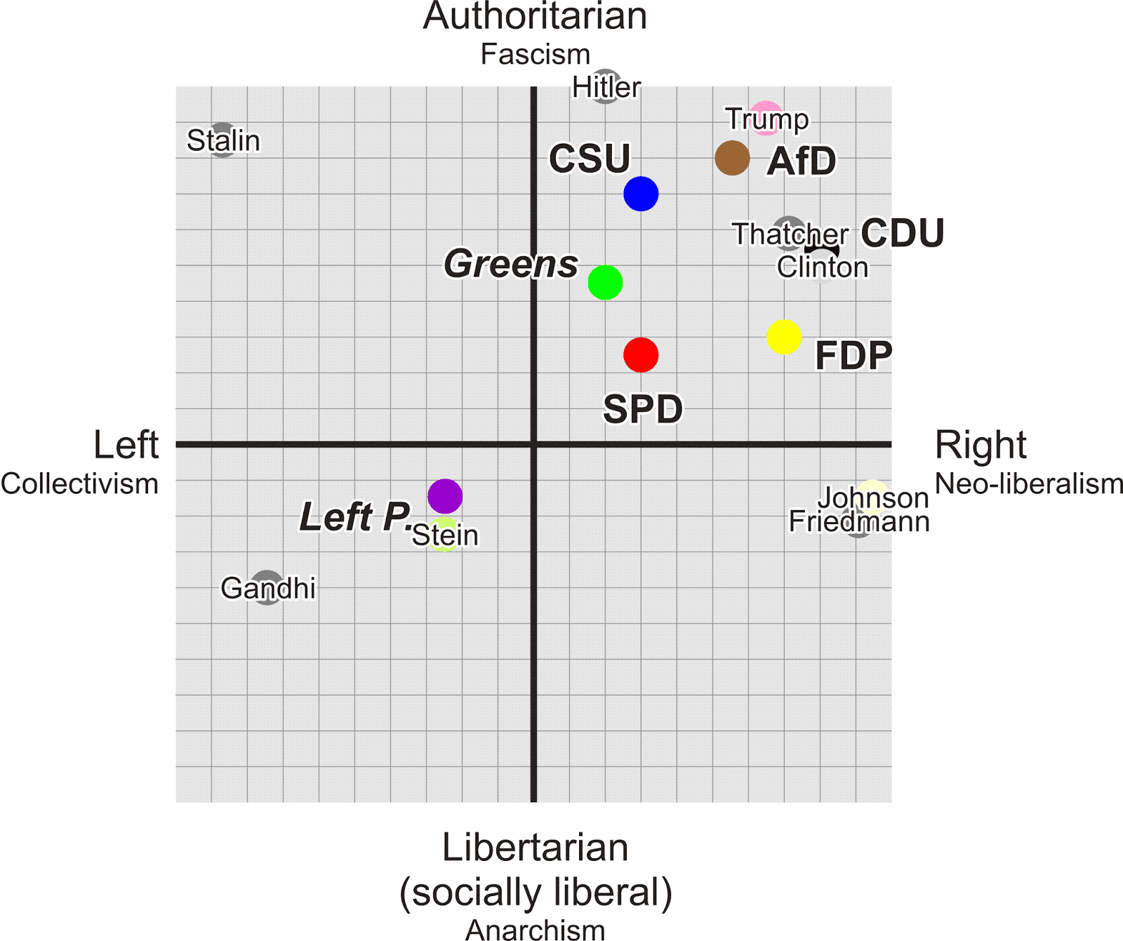 | Classification of the six parties in the new Bundestag by the Political Compass along a social (libertarian–authoritarian) and economic (left–right) axis. (In)famous historical persons and candidates in the U.S. 2016 presidential election have been added for orientation. |