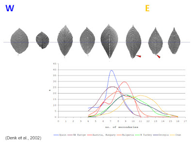 | Anzahl der Sekundärvenen (secondaries) und Blattmorphologien der Buchen von Spanien bis Iran. |